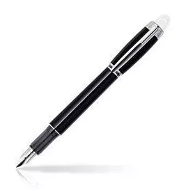 PAttributs platinés hautement polis, résine précieuse noire, agrafe platinée et hautement polie, gravée du nom Montblanc et du numéro de série, emblème Montblanc en suspension dans le sommet transparent du capuchon, résine précieuse noire.
