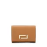 fermoir bouton pression ; face avant : une poche pour la monnaie, deux fentes pour cartes ; face arrière : deux compartiments pour billets, deux poches plaquées, quatre fentes pour cartes.